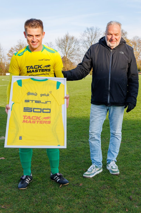 Zijn medespelers vormden vooraf een erehaag. Voorzitter Ad den Engelsman overhandigde hem een ingelijst shirt in de clubkleuren, met daarop in levensgrote cijfers het magische getal: 500. Natuurlijk werden er ook foto’s gemaakt van het historische moment, met partner Kimberly en de kinderen erbij. Van de supporters volgde een gul applaus. Steijn had genoten van de huldiging. ,,Zoveel wedstrijden in het eerste elftal is heel speciaal.’’ Steijn debuteerde destijds als jonge gast, in de eerste periode dat Peter van Poortvliet coach was. Zoveel jaar later staat het team opnieuw onder leiding van Van Poortvliet. Twee generaties verder is Steijn er nog steeds bij. ,,Ik vind het nog altijd leuk en ben fit.’’